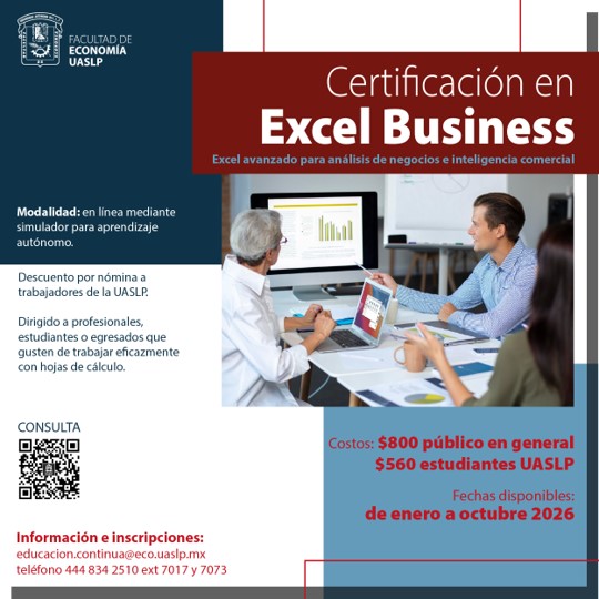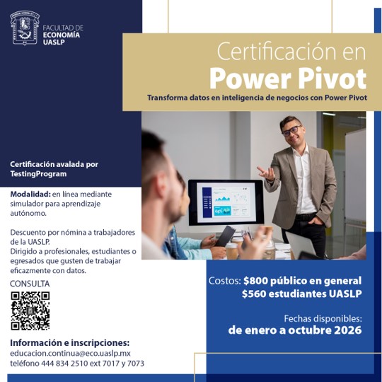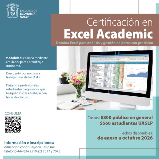Más información e inscripciones: educacion.continua@eco.uaslp.mx o al teléfono 444 834 2510 ext. 7017 y 7073